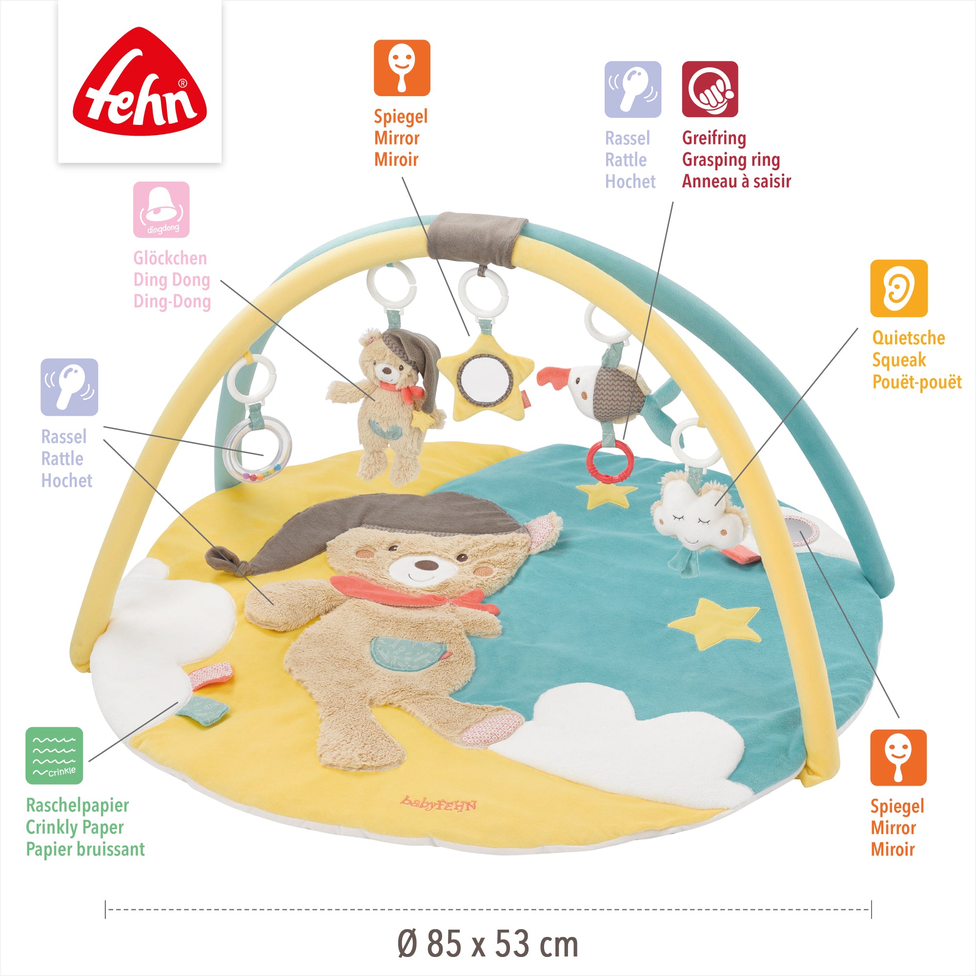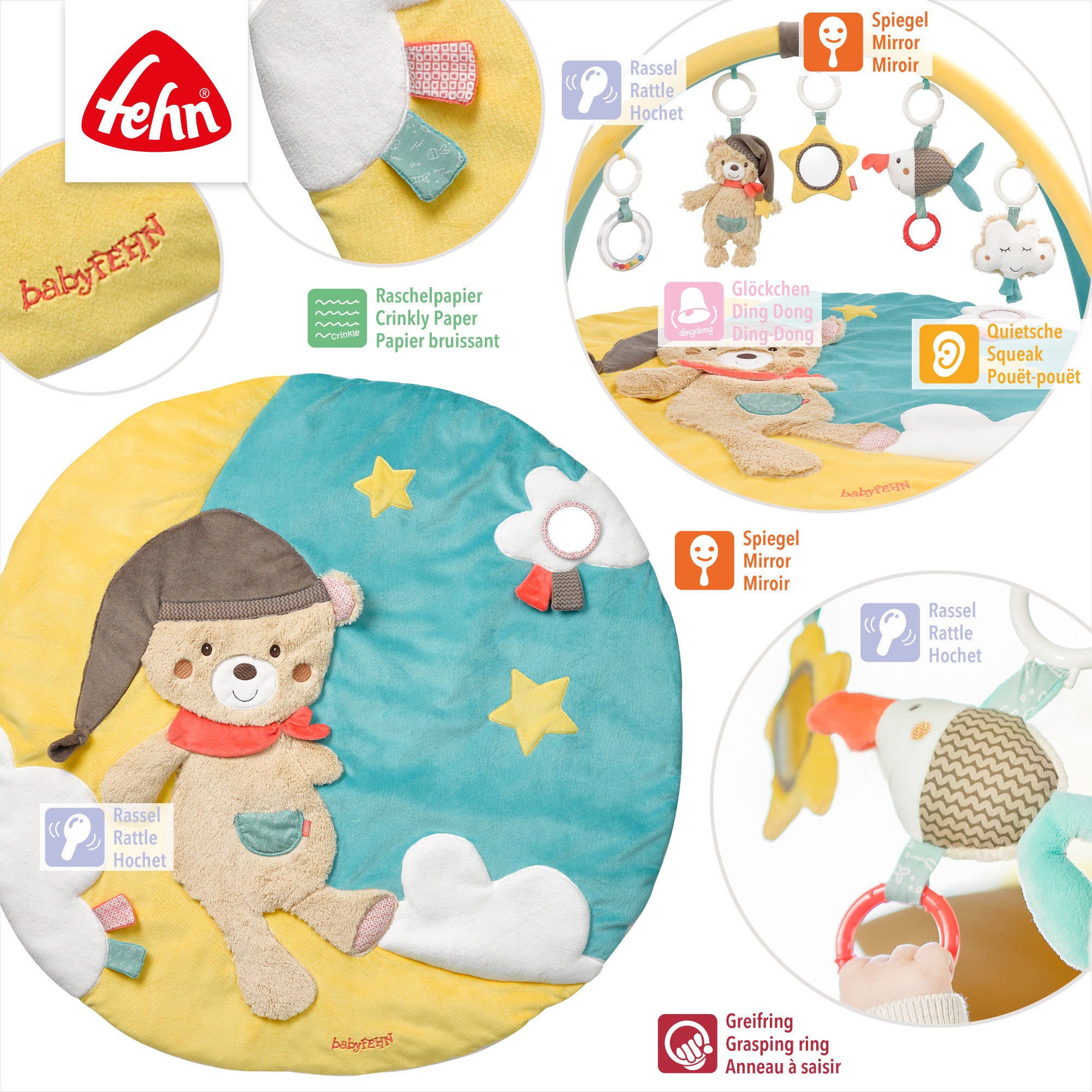 • FÖRDERUNG DER MOTORIK - Das verborgene Raschelpapier, die lustige Quietsche, der kleine Spiegel, der süße Rassel-Ring und ein Glöckchen fördern die motorischen Fähigkeiten und wecken eine natürliche Neugier zum Greifen, Kuscheln und Spielen