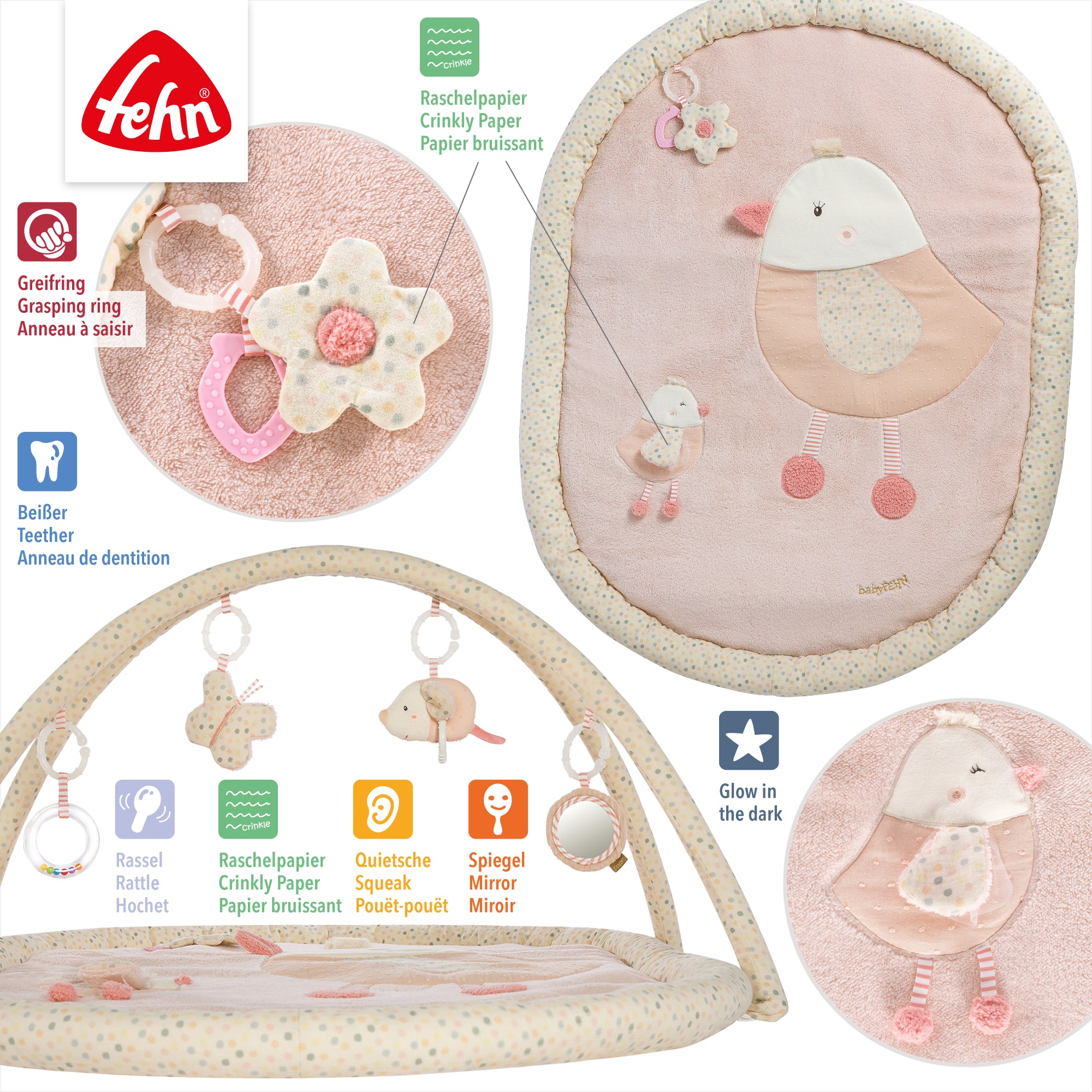 • mit Raschelpapier, Quietsche, Rasselring, Softbeißer, Greifring, Spiegel, Materialmix & „Glow-in-the-dark“ Bestickung