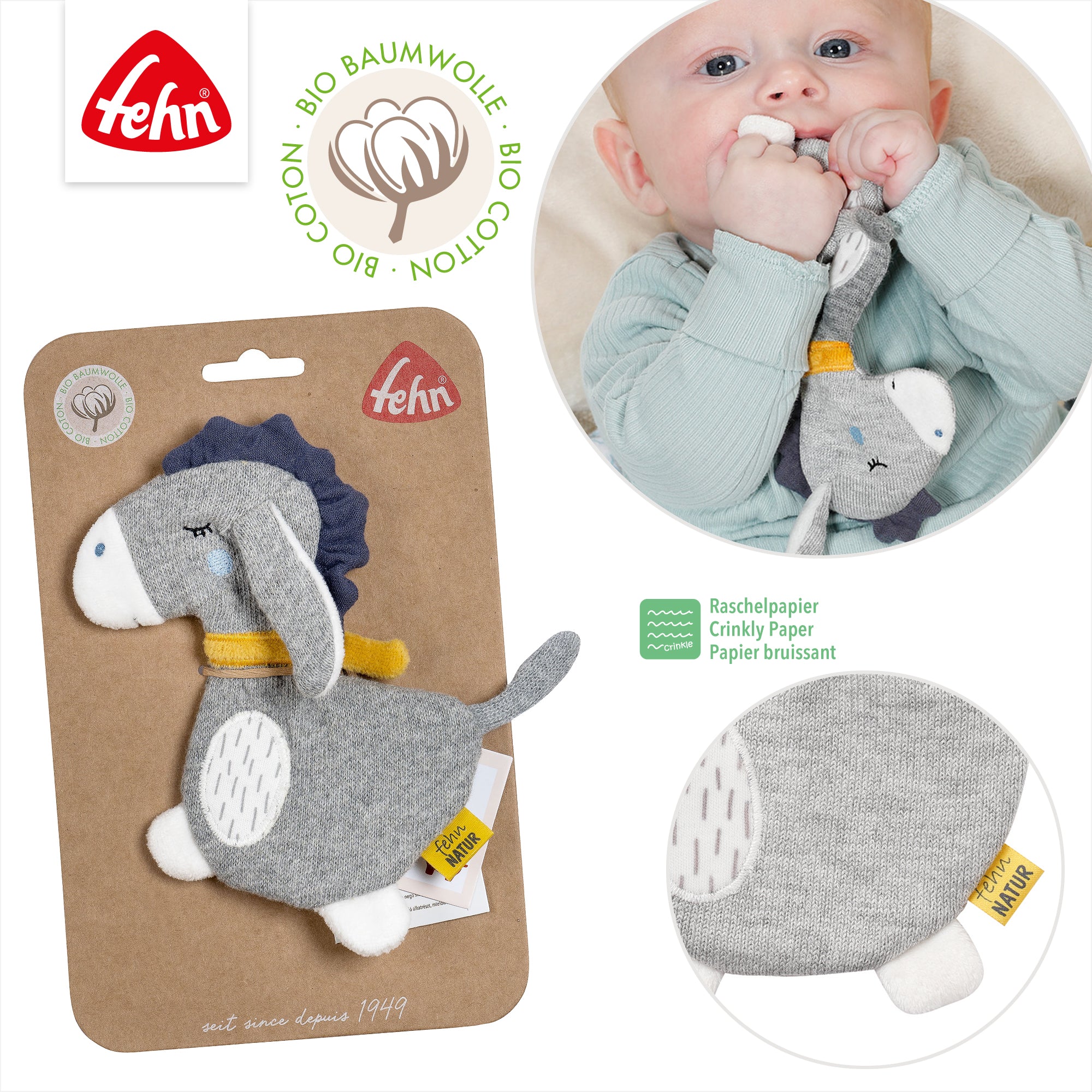 • SPANNENDES SPIELZEUG - Dieses kuschelige Knistertier von Fehn ist das Spielzeug, das kein Baby mehr aus der Hand legt: Der Esel lädt zum Entdecken, Fühlen und Spielen ein, ohne dass dabei Langeweile aufkommt