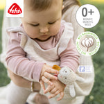 • KUSCHELIGE VIELFALT - Die Armband-Rassel lädt mit kuschelweichen Obermaterialien wie Jersey, Frottee, Nicki und Musselin sowie einer Füllung aus Bio-Baumwolle zum Greifen und Fühlen ein