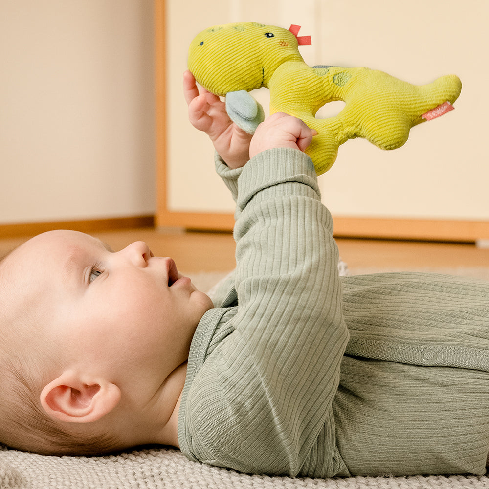 • TREUER BEGLEITER - Der kleine Dino Diego als Greifling ist ein treuer Begleiter: Diego ist ideal zum Greifen & Kuscheln, die integrierte Rassel weckt Babys Entdeckergeist im Nu und regt zum Spielen an