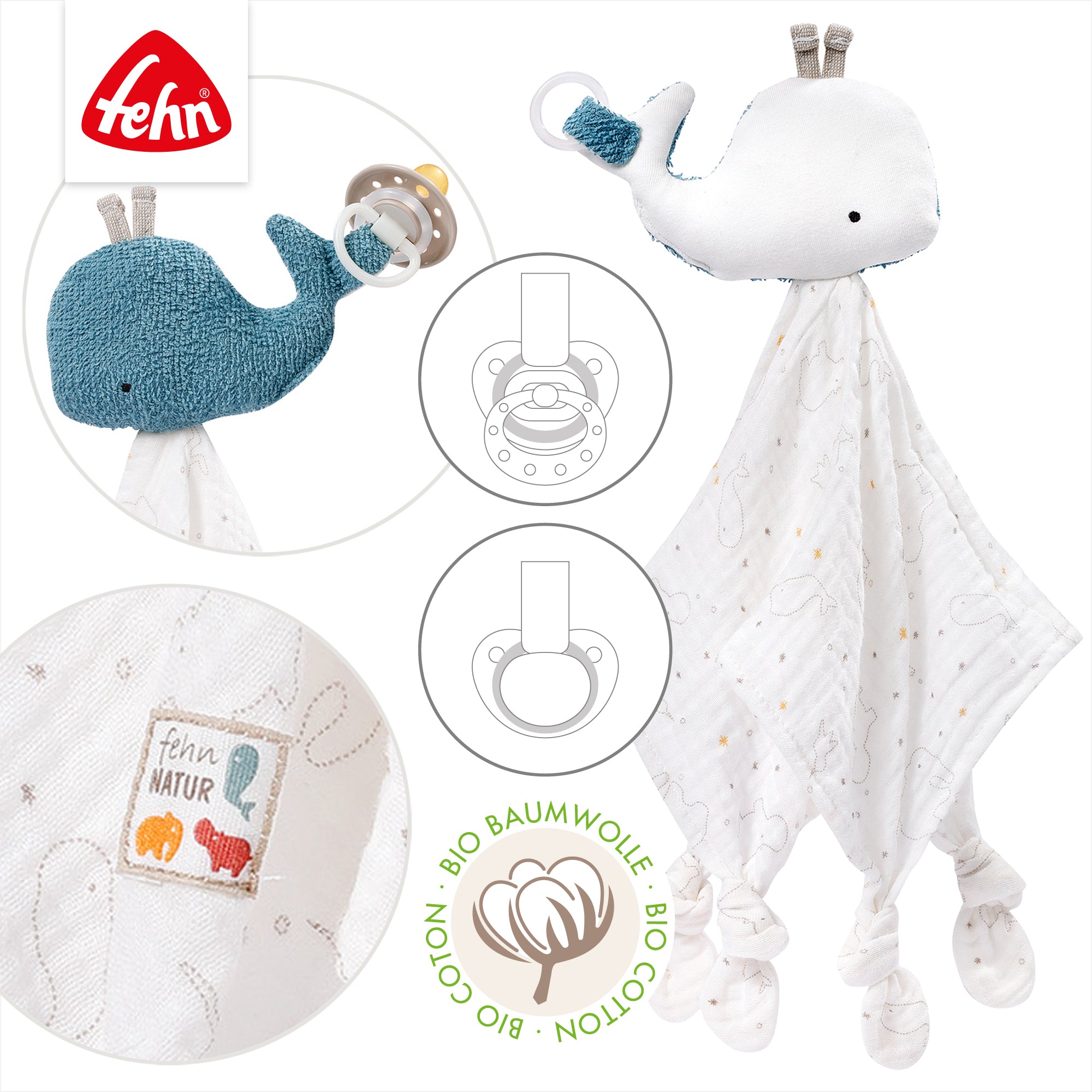 Stofftier-Schnuffeltuch mit Bio-Baumwolle aus kontrolliert biologischem Anbau mit Schnuller-Befestigung für Babys & Kleinkinder ab 0+ Monaten