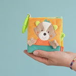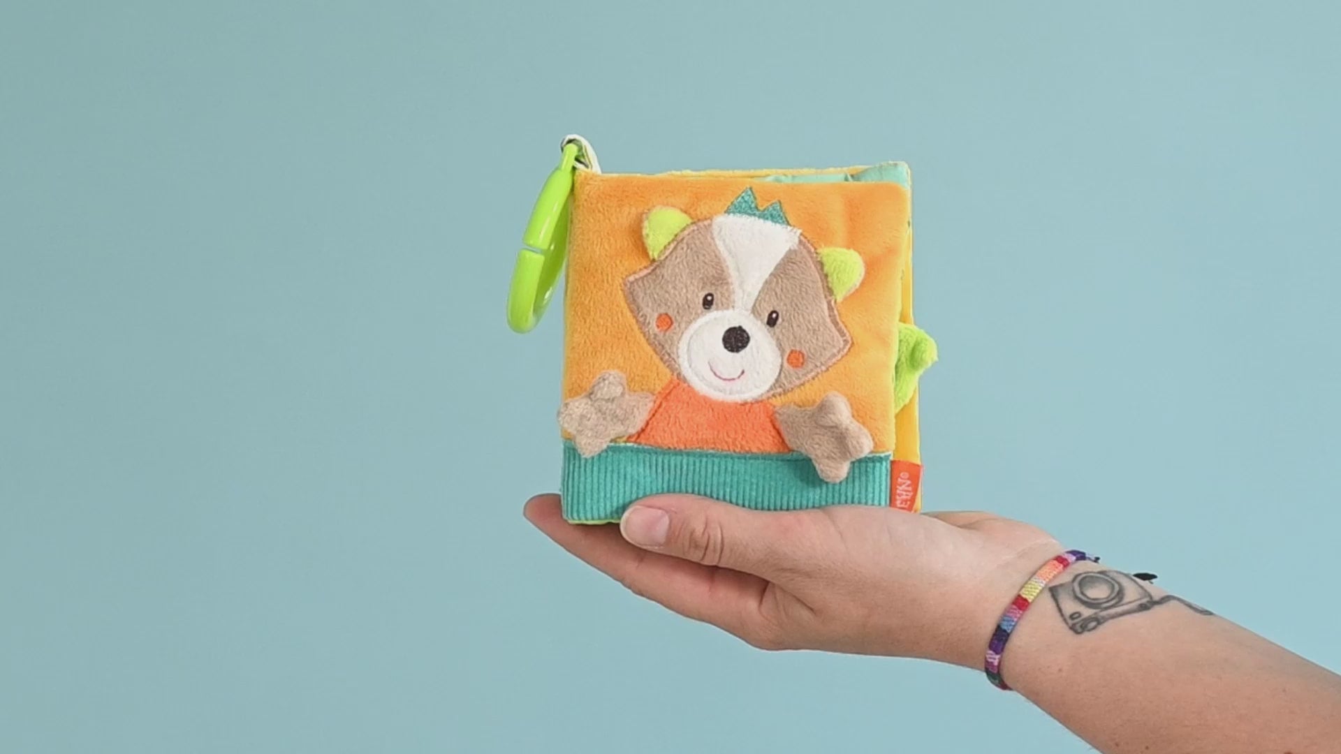 • PRAKTISCHE BEFESTIGUNG - Der Befestigungsring am kuscheligen Bilderbuch sorgt dafür, dass es ganz leicht und sicher an der Babyschale, am Kinderwagen, Buggy, am Babybett oder im Auto befestigt werden kann